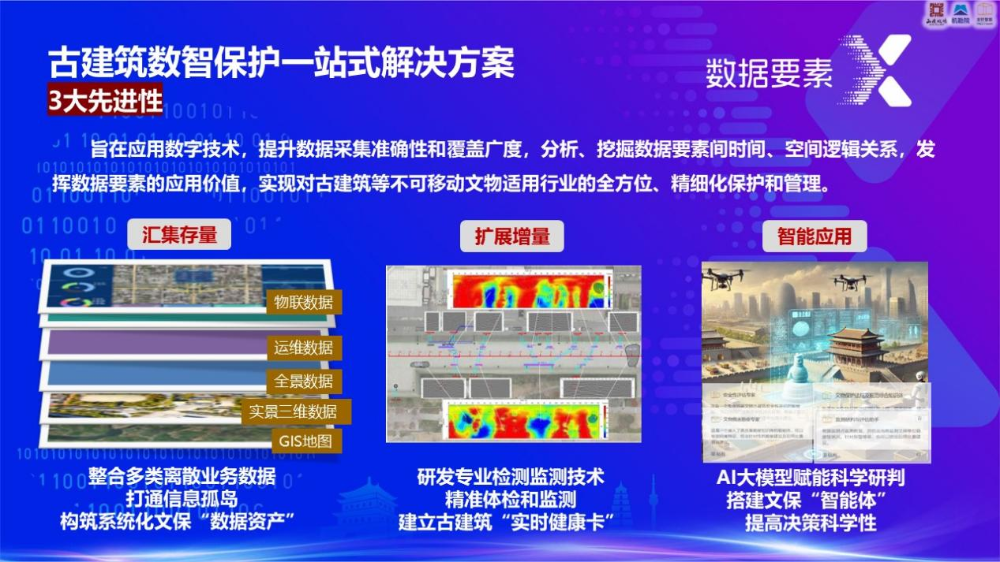 方案團(tuán)隊將多年來在西安城墻的研究成果提煉轉(zhuǎn)化,依托“數(shù)字方艙”綜合管理平臺為基石,通過“1個數(shù)據(jù)底座”“1套管理平臺”互聯(lián)互通,將城墻隱患排查成果、監(jiān)測研判成果、預(yù)防性保護(hù)成果等應(yīng)用于“4類核心場景”,充分發(fā)揮數(shù)據(jù)要素的應(yīng)用價值,著力推進(jìn)科學(xué)技術(shù)對文物事業(yè)發(fā)展的支撐引領(lǐng)作用,以數(shù)據(jù)為關(guān)鍵要素的數(shù)字文保產(chǎn)業(yè),推出“古建筑數(shù)智保護(hù)一站式解決方案”,實現(xiàn)對不可移動文物中古建筑、古遺址等文物保護(hù)領(lǐng)域及生態(tài)保護(hù)、自然遺產(chǎn)景區(qū)、水利水域風(fēng)景區(qū)、文化旅游景區(qū)等領(lǐng)域的科學(xué)化精細(xì)化、系統(tǒng)化保護(hù)和管理。
