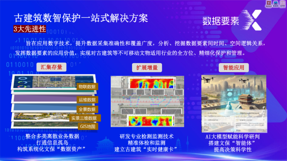 在此基礎(chǔ)上,機(jī)勘院文保院推出了“古建筑數(shù)智保護(hù)解決方案”,該方案不僅適用于不可移動(dòng)文物中的古建筑與古遺址保護(hù),還廣泛拓展至生態(tài)保護(hù)、自然遺產(chǎn)景區(qū)、水利水域風(fēng)景區(qū)及文化旅游景區(qū)等領(lǐng)域,實(shí)現(xiàn)了科學(xué)化、精細(xì)化與系統(tǒng)化的保護(hù)與管理。該成果在2024年“數(shù)據(jù)要素X”大賽陜西分賽的文化旅游賽道上榮獲一等獎(jiǎng)。