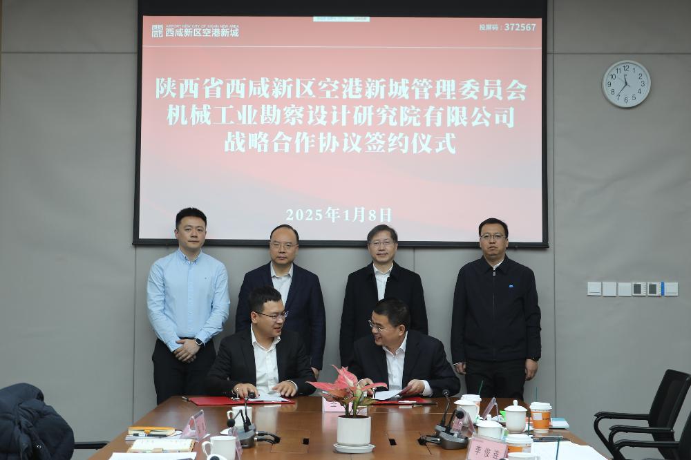 1月8日,機(jī)勘院與陜西省西咸新區(qū)空港新城管理委員會(以下簡稱“空港新城”)舉行戰(zhàn)略合作協(xié)議簽約儀式。機(jī)勘院黨委書記、董事長、總經(jīng)理邵雪奎,空港新城黨委副書記劉軍出席儀式并見證簽約。