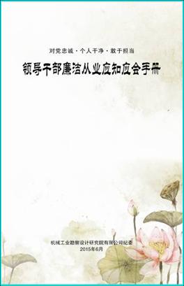 本著簡明、實用的原則,該手冊以《國機集團進一步推進廉潔文化建設實施意見》代序,輯錄了《習近平:領導干部要知曉為官做事尺度》和《國有企業(yè)領導人員廉潔從業(yè)若干規(guī)定》等中央、國務院國資委和集團公司對國企領導干部廉潔從政從業(yè)的法律法規(guī)、黨紀條例和基本要求,和機勘院《踐行中央八項規(guī)定厲行勤儉節(jié)約反對奢侈浪費規(guī)范履職待遇業(yè)務支出暫行辦法》、《新任領導干部廉潔從業(yè)承諾書》等企業(yè)相關制度;《常用廉政建設術語須知》對“兩個責任”、“一崗雙責”等進行了詮釋,《廉潔名言賞析》選登的20條古今中外格言警句瑯瑯上口,《廉政故事史鑒》中的“四菜一湯的來歷”等令人印象深刻、“關西夫子”潼關人楊震“四知拒金”和清朝第一位陜籍狀元王杰“手好不要錢”如近在咫尺不由而生敬意。