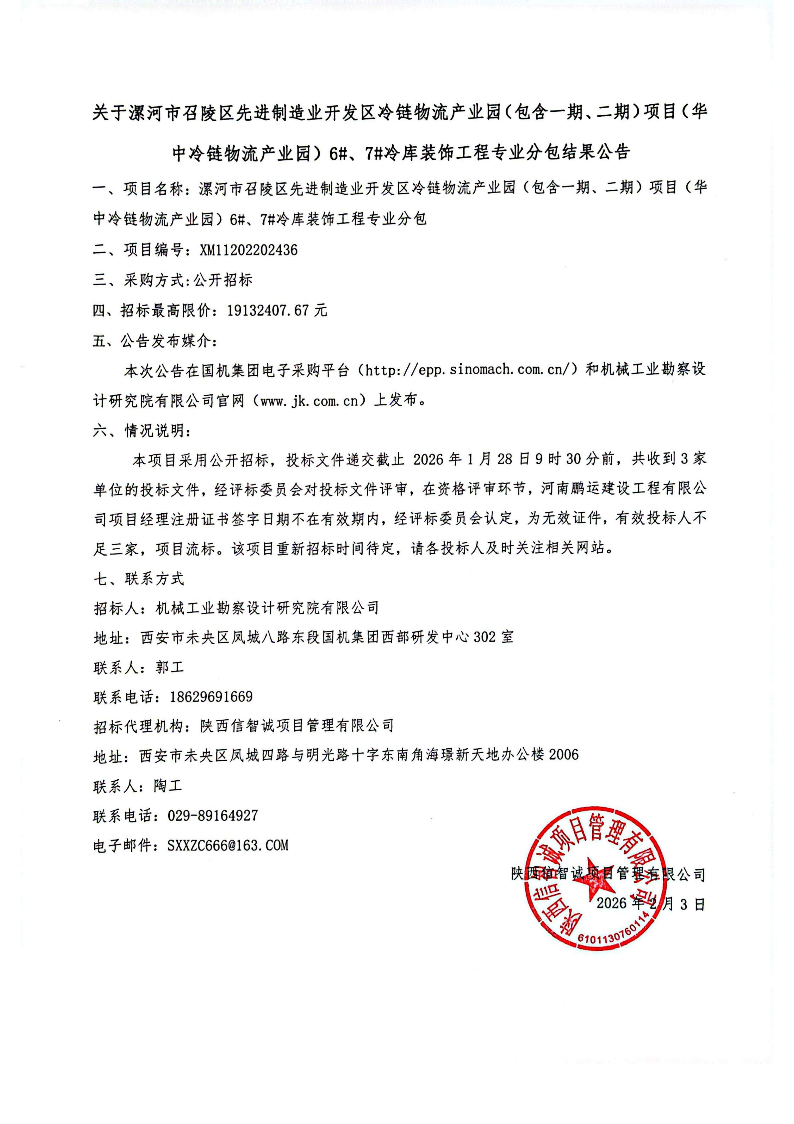 漯河市召陵區(qū)先進制造業(yè)開發(fā)區(qū)冷鏈物流產(chǎn)業(yè)園(包含一期、二期)項目(華中冷鏈物流產(chǎn)業(yè)園)6#、7#冷庫裝飾工程專業(yè)分包流標(biāo)公告