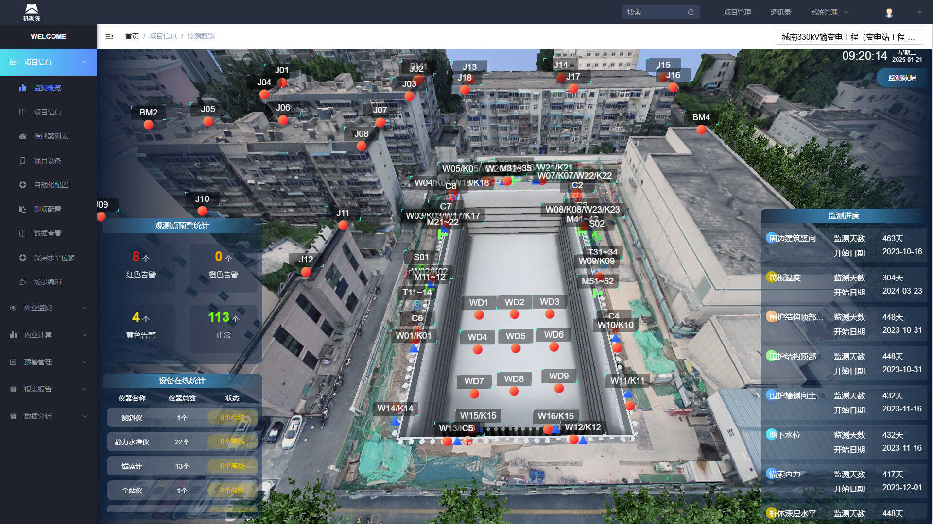 項目團(tuán)隊依托深厚技術(shù)積累與豐富實踐經(jīng)驗,充分發(fā)揮在工程監(jiān)測領(lǐng)域的專業(yè)優(yōu)勢,將 BIM、測量機(jī)器人自動化監(jiān)測、物聯(lián)網(wǎng)、云計算分析等前沿技術(shù)深度融合,創(chuàng)新性提出“三維實景監(jiān)測概覽一張圖”理念,構(gòu)建起覆蓋施工全周期的智能化監(jiān)測預(yù)警云平臺。通過這一平臺,實現(xiàn)了監(jiān)測數(shù)據(jù)實時采集、傳輸、分析與反饋,與施工決策高效協(xié)同,為城南 330kV 變電站工程信息化施工管理提供科學(xué)化、實時化、精細(xì)化的技術(shù)保障,確保項目在復(fù)雜環(huán)境下安全、高效推進(jìn),順利建成投用。