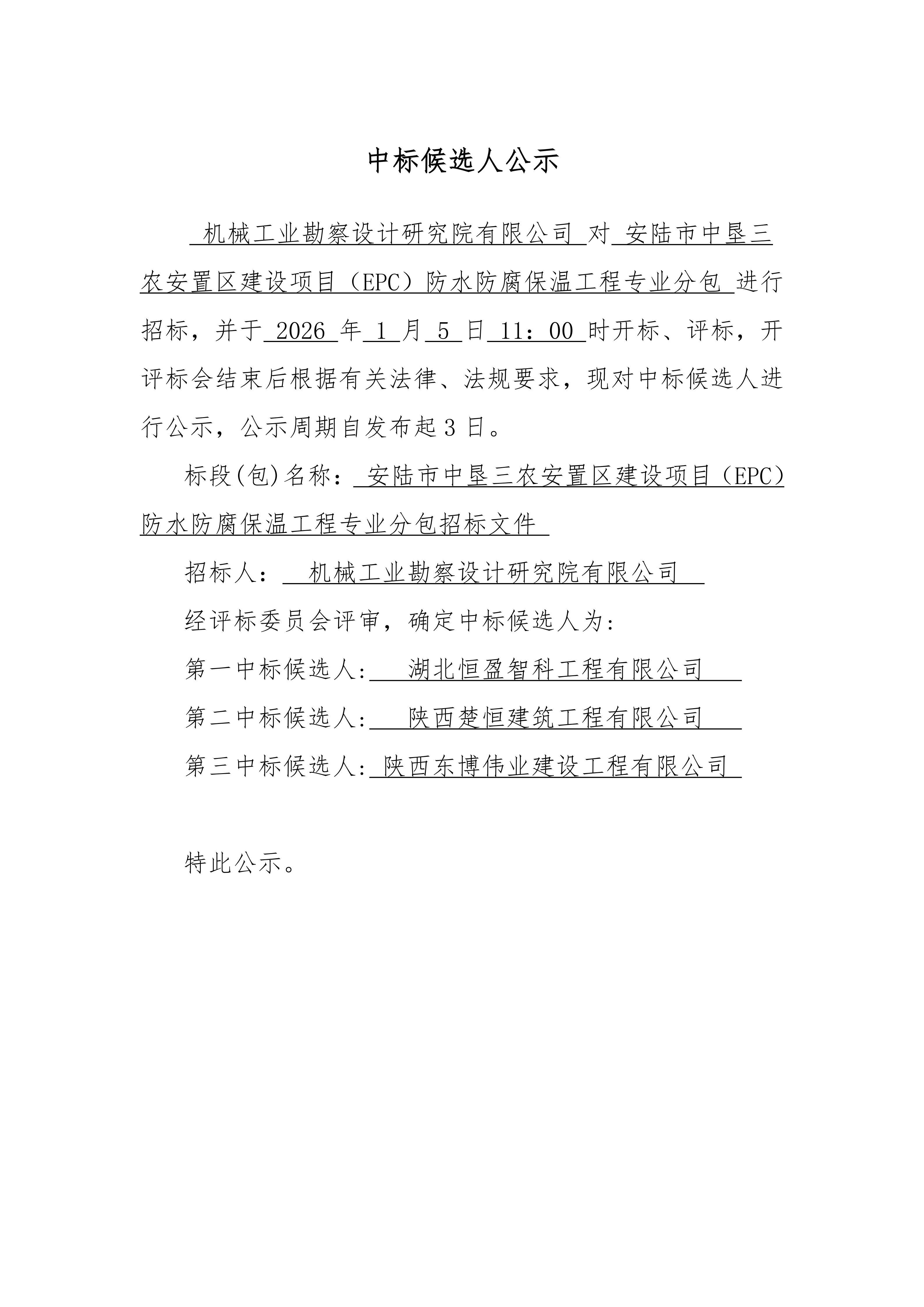 安陸市中墾三農(nóng)安置區(qū)建設(shè)項(xiàng)目(EPC) 防水防腐保溫工程 專業(yè)分包中標(biāo)候選人公示